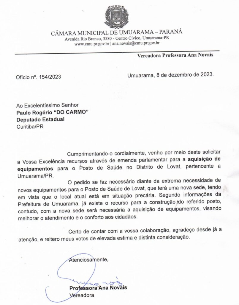 O deputado estadual Do Carmo (União Brasil) esteve em Umuarama na última sexta-feira (8) para fazer o repasse oficial de recursos para o programa Meu Campinho e para a área da saúde, para a aquisição de equipamentos para o posto de saúde do distrito de Lovat. Ele foi acompanhado pela vereadora Ana Novais e o assessor Jonesberto Vivi.