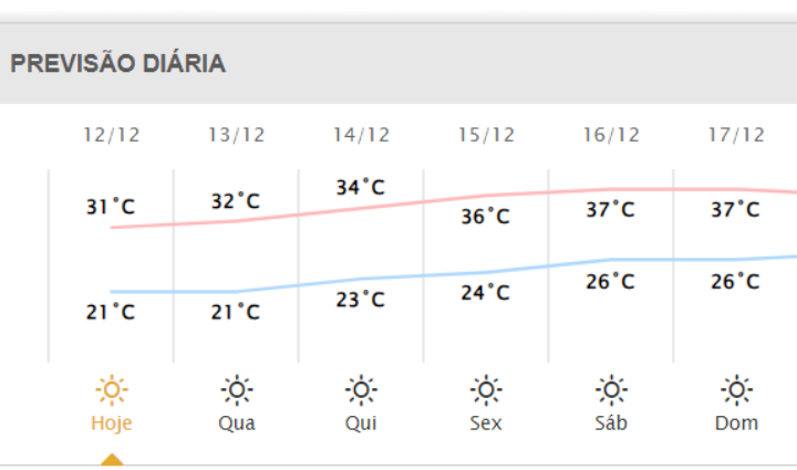 Nesta terça-feira (12) em Umuarama os termômetros já marcam 31ºC, com uma sensação térmica de 35ºC. Para restante da semana o Instituto de Meteorologia Simepar prevê uma mínima de 21ºC e uma máxima de 36ºC na Capital da Amizade. No final de semana a variação térmica deverá oscilar entre 26ºC e 37ºC. Ambos os dias apresentarão céu claro.