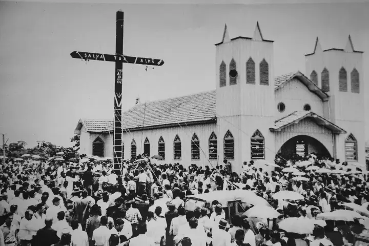 Ela era pequena, toda de madeira de peroba. O altar tinha um espaço bem calculado e facilitava os padres na celebração das missas. Acomodava no máximo 600 pessoas sentadas. Mas a comunidade católica era imensa.