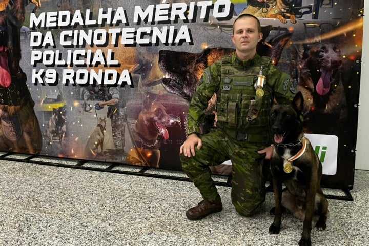 O Policial Militar Soldado Minikoski e o cão de faro Nero da 4ª Companhia do Batalhão de Polícia de Fronteira (4ª Cia do BPFron) de Umuarama foram agraciados com a Medalha Mérito da Cinotecnia Policial ‘K9 Ronda’.