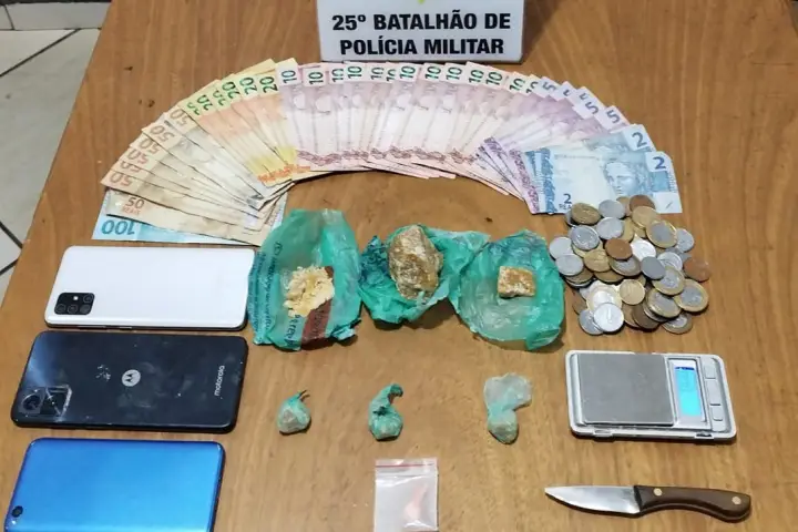 Também foram encontradas 30 pedras prontas para a venda, uma balança de precisão, uma faca com resquícios da droga, e mais R$ 20 em moedas e um celular.