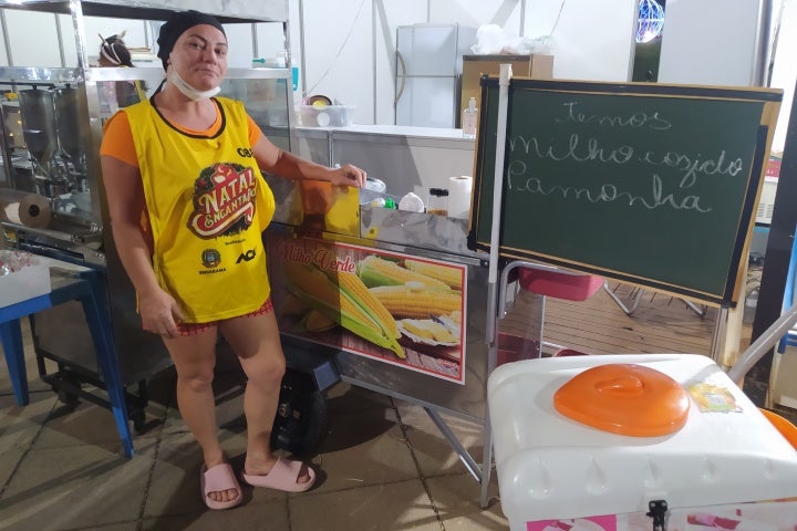 Mas tem também hambúrguer, cachorro quente, espetinho de carne, maçã do amor, cocada, milho verde debulhado no pote, sorvete expresso, bolachinha de natal decoradas, pipoca, entre outras guloseimas.