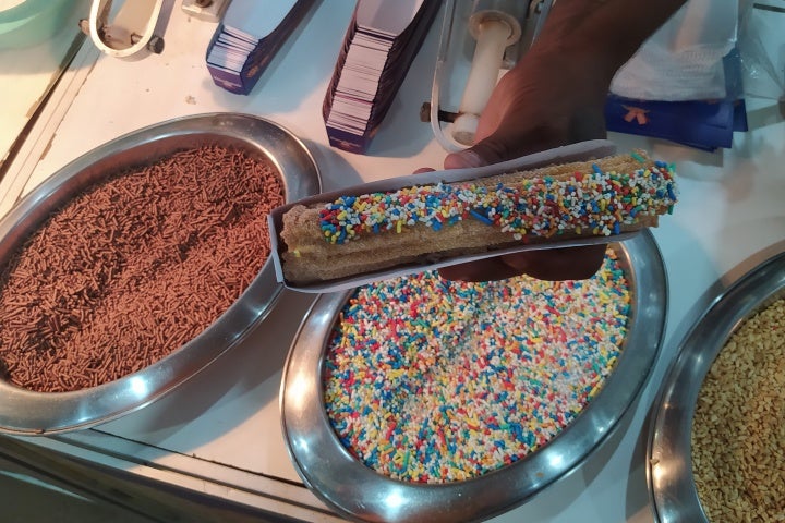 São 18 estandes, com cardápio variado: doces, salgados, bebidas, tem para todo gosto. O crepe é opção em quase todos; a oferta de pastel, churros e batata frita também é concorrida.