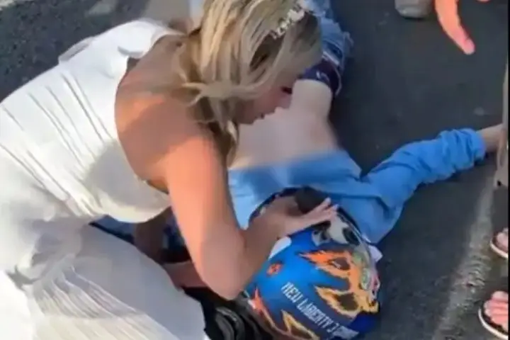 Vídeos feitos por testemunhas mostram o momento que a mulher, ainda no vestido de casamento, presta os primeiros socorros para a vítima, que está inconsciente, enquanto o noivo liga para o Siate (Serviço Integrado de Atendimento ao Trauma em Emergência).