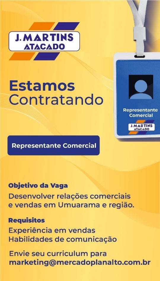 A J. Martins Atacado de Umuarama divulgou pelas redes sociais que está com uma vaga disponível para o cargo de representante comercial. Dentre os requisitos, é exigido experiência com vendas e habilidade em comunicação.