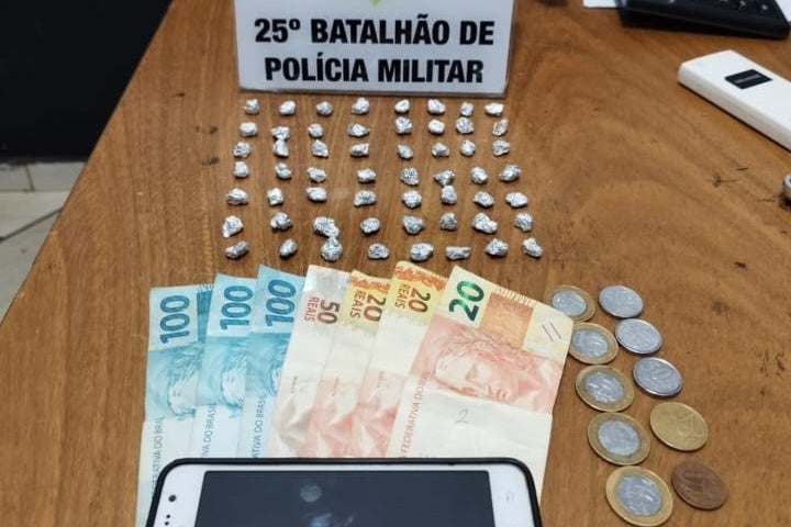 Em uma busca pelo terreno em frente ao suspeito, os policiais encontraram uma bolsinha de tecido contendo 56 pedras de crack envoltas em papel alumínio.
