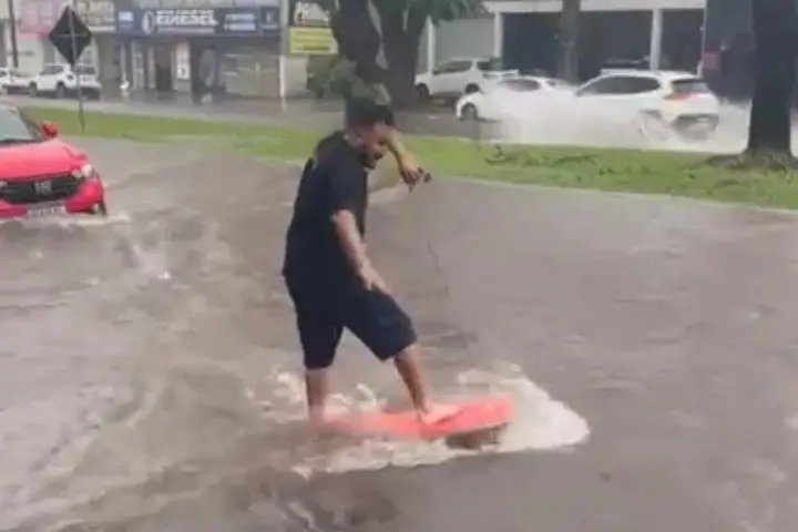 Nas imagens – assista abaixo – é possível ver o maringaense em cima da prancha enquanto brinca como se estivesse “pegando onda” na via, que está completamente tomada pela água, inclusive cobrindo parte de um automóvel que está logo atrás.