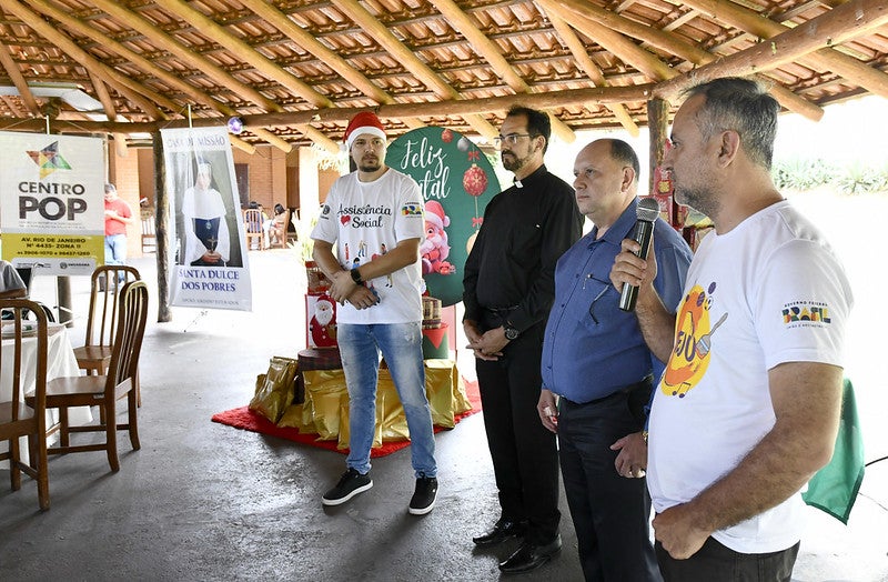 O almoço natalino teve a presença do coordenador do Creas (Centro de Referência Especializado de Assistência Social), Ivo Galdino, da diretora da Secretaria de Assistência Social, Adnetra Veira Santana, da chefe da Proteção Básica, Dayanne Paola Demozzi, do representante nacional da população em situação de rua, José Cirineu Pereira Rocha, do padre Luiz César – que concedeu a bênção dos alimentos – e a animação ficou por conta do músico e coordenador do Centro da Juventude, Jeferson Ferreira – o Jefinho.