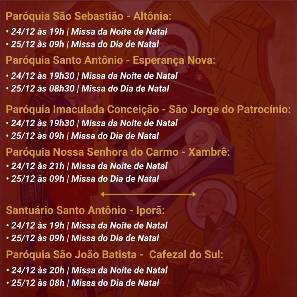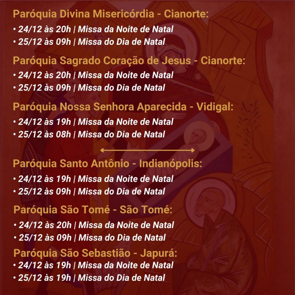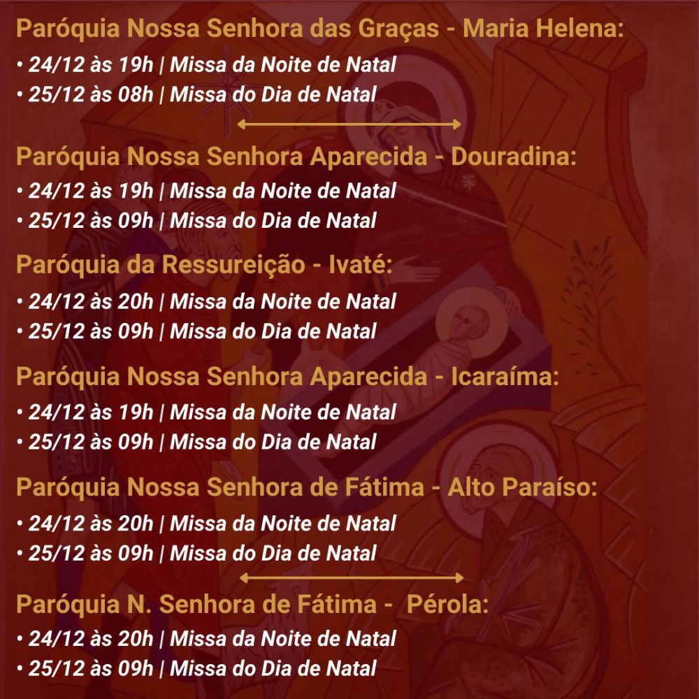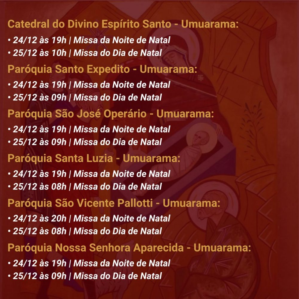 A Diocese de Umuarama divulgou os horários das celebrações natalinas nas diversas paróquias da sua região de abrangência. Na maioria delas haverá missas na noite de domingo (24), que é a véspera do Natal, e também na segunda-feira, dia 25.