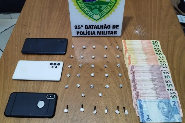 A equipe seguiu para o local indicado e realizou abordagens em frente ao bar, onde foram encontradas 19 miligramas de crack; 4 miligramas de cocaína; 3 celulares; e R$ 262 em notas diversas com os homens de 32, 21, 21 e com a mulher de 24 anos – que tentou se desfazer das drogas ao perceber a viatura.