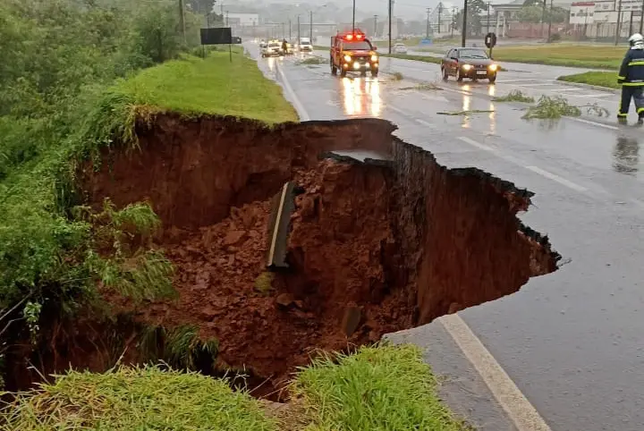 O Corpo de Bombeiros informou que uma cratera se formou na rodovia PR-323, no trecho urbano de Umuarama, nas imediações da Havan. O buraco surgiu durante a tempestade que atingiu toda a região.