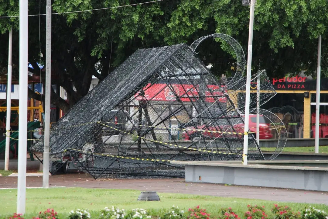 Na Praça Miguel Rossafa a “caixa de presentes”, objeto decorativo do Natal, foi danificada, porém as equipes de eletricistas já providenciaram o desligamento de energia (para evitar quaisquer possíveis acidentes).
