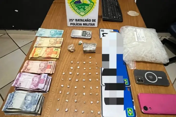 Uma equipe foi até o local e, durante a abordagem com a proprietária e com um jovem que estava no local, foi encontrado 24,2 gramas de crack em diversas pedras; 84 gramas de maconha em duas porções, R$ 1.161,00; um saco de pinos Eppendorf – utilizados para embalar cocaína – com centenas deles; uma balança de precisão; duas placas Mercosul; e 2 celulares.