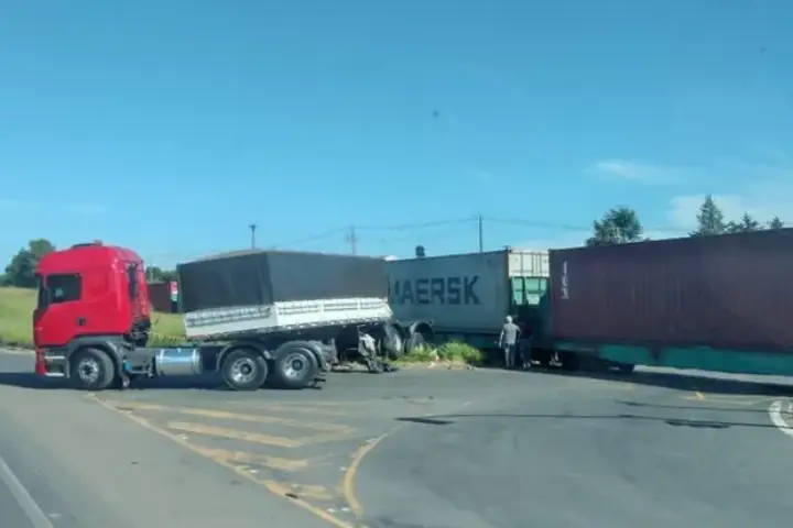 Um caminhão foi partido ao meio após colidir com um trem na entrada da Vila Borato, em Ponta Grossa, na manhã desta quarta-feira (3). Imagens compartilhadas mostram a carga da carreta dividida após o impacto. A colisão aconteceu quando a composição ferroviária atravessava a linha. Apesar da intensidade do choque, não houve registro de feridos no incidente.