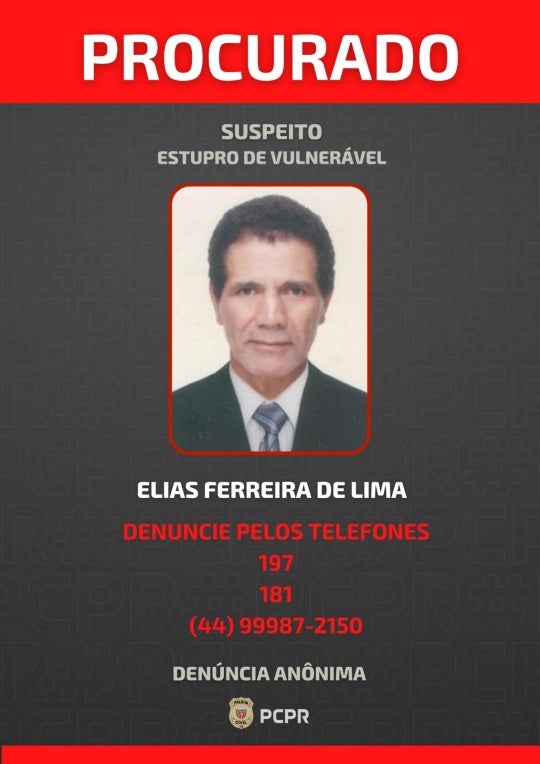 A Polícia Civil do Paraná (PCPR) divulga a foto de Elias Ferreira de Lima, de 60 anos, condenado pelo crime de estupro de vulnerável ocorrido em 2013, em Iporã, na região Noroeste do Estado.