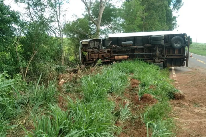 O condutor de um caminhão Ford Cargo 1119 com placas de Iporã, de 46 anos, ficou ferido após o tombamento do veículo no fim da manhã desta sexta-feira (5), na PR-490, entre Altônia e Iporã.