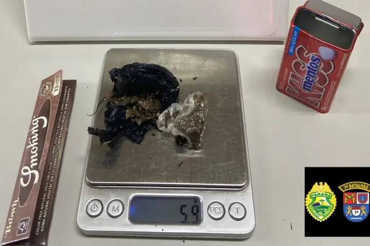 Durante revista pessoal, os policiais encontraram em um de seus bolsos a quantia de 5,9 gramas de maconha em um invólucro de plástico. Além da droga, também foram localizadas uma embalagem de seda (papel para enrolar a maconha).