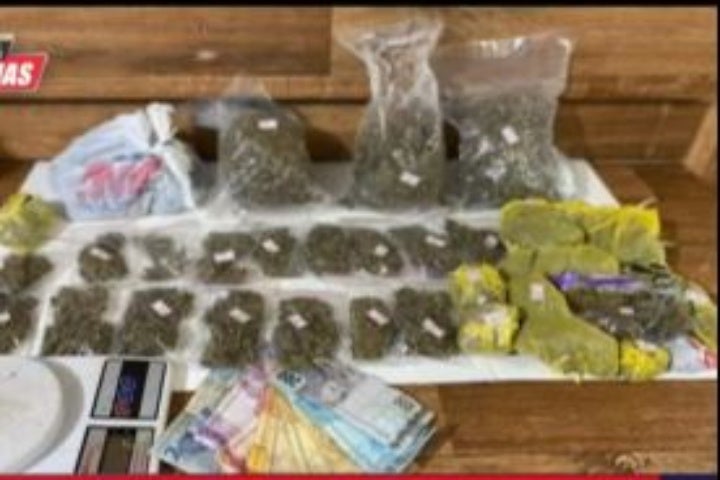 Ao realizar busca no terreno, identificou-se uma mochila preta semelhante àquela do motociclista, contendo diversos invólucros de maconha prontos para venda, além de uma balança de precisão. Dentro da residência, foram encontrados 1,8 kg de maconha, distribuídos na geladeira (717g) e no guarda-roupa do suspeito que mora no local (433g), acompanhados de R$ 503 em espécie.