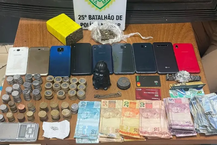 Após a abordagem, as equipes entraram na residência onde foram encontradas drogas e produtos provenientes de furtos. Ao todo, foram localizadas 5 pedras de crack, pesando aproximadamente 0,4 gramas; 1 tablete quadrado e porções fracionadas de uma substância análoga à maconha, totalizando cerca de 330 gramas; R$ 1.389,00 em espécie; R$ 216,00 em moedas; 9 celulares; 1 relógio STAIN ESS; 1 balança de precisão; 1 pulseira dourada; 2 cartões bancários; 2 caixas de papel seda e 2 dichavadores.