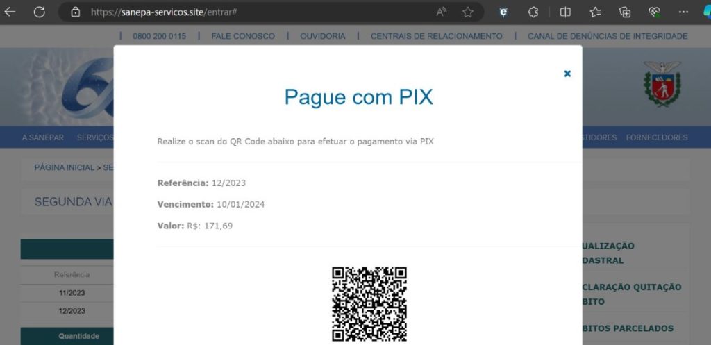 O site em questão é uma reprodução quase idêntica do oficial, porém é possível observar que no link de acesso há erros, como “sanepa.com.br” em vez de “sanepar.com.br,” faltando a letra “R” no final. Roseli informa que já entrou em contato com a empresa para relatar o ocorrido, registrou um boletim de ocorrência e está compartilhando a experiência para alertar outras pessoas a fim de evitar que também se tornem vítimas.