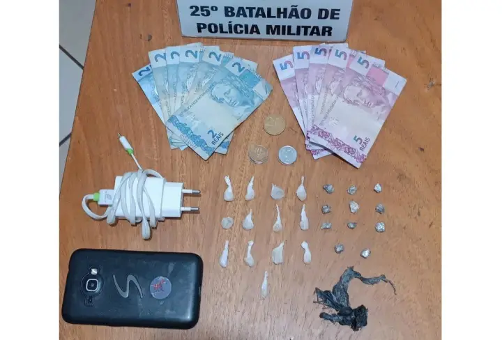 A PM fez a abordagem e encontrou invólucros de plástico com crack no nariz e no bolso lateral da bermuda do homem de 41, além de R$ 20 (distribuídos em duas notas de R$ 5 e cinco notas de R$ 2).