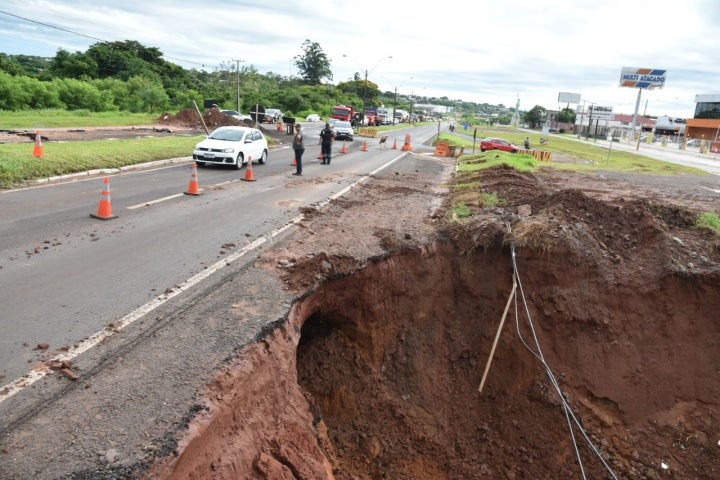 A cratera que se formou na rodovia PR-323 em Umuarama no dia 23 de dezembro durante uma tempestade que atingiu toda a região, voltou a crescer devido a uma nova tempestade que atingiu o município, na madrugada desta segunda-feira (15). As autoridades agora estão implementando o método ‘pare e siga’ para permitir que os veículos atravessem o trecho com mais segurança. No entanto se as chuvas persistirem, há previsão de interdição completa da pista o que exigirá que os motorista passem por dentro do município.
