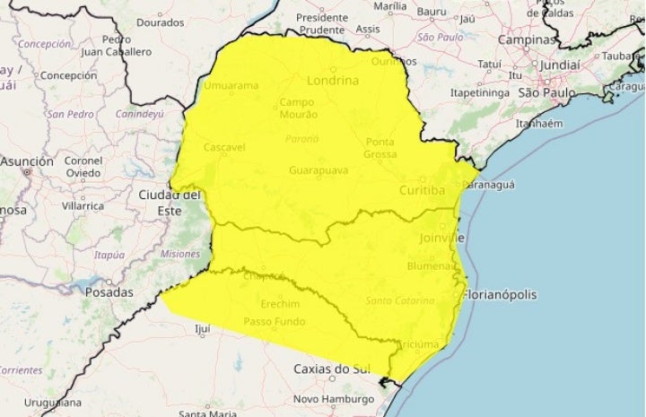 O Instituto Nacional de Meteorologia também divulgou um alerta amarelo indicando o risco de tempestades no Paraná (incluindo a região de Umuarama), em Santa Catarina e parte do Rio Grande do Sul.