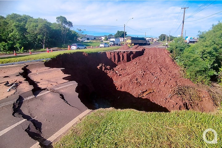 O novo buraco surgiu a poucos metros da cratera que se formou na rodovia em 23 de dezembro durante uma tempestade que afetou toda a região. A cratera aumentou de tamanho devido a uma nova tempestade que atingiu o município na madrugada desta segunda-feira (15).