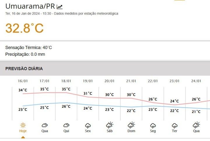 Os umuaramenses estão enfrentando mais um dia de bastante calor nesta terça-feira (16). Por volta das 15h30 a temperatura estava em 32,8ºC e a sensação térmica chegou aos 40ºC, de acordo com o instituto de meteorologia Simepar. A Capital da Amizade não tem previsão de chuvas, apesar de algumas nuvens no céu.