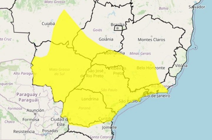 O Instituto Nacional de Meteorologia (Inmet) também divulgou um aviso de chuvas intensas que abrange oito estados, incluindo todo o Paraná. O alerta entrou em vigência às 15h25 desta quarta e é válido até 10h de quinta-feira (18).