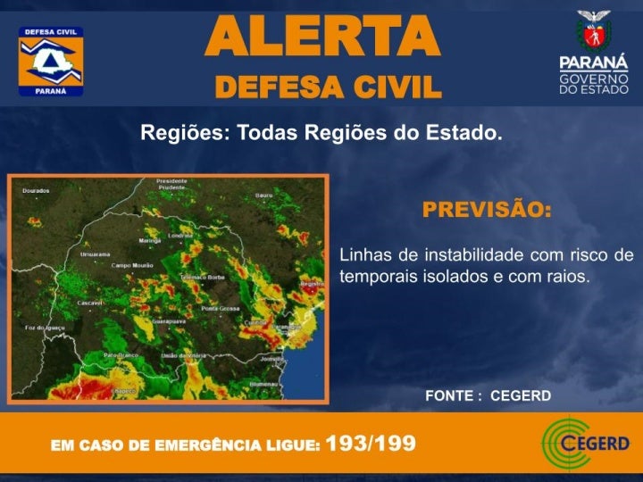 A Defesa Civil do Paraná divulgou um alerta indicando a ocorrência de chuvas intensas com raios na região de Umuarama. O aviso foi enviado 15h30 desta quarta-feira (17) e tem vigência de 6 horas, ou seja, é válido até 21h30.