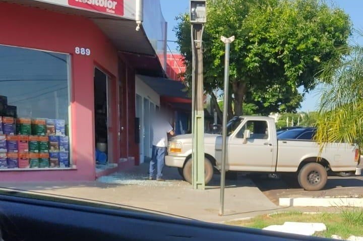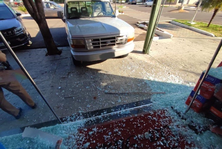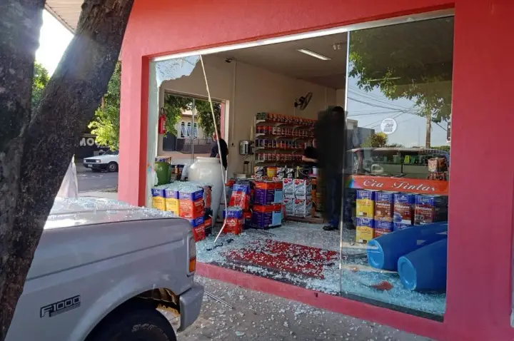 Caminhonete entra em loja de tintas no centro de Pérola, quebra porta de vidro e vasos