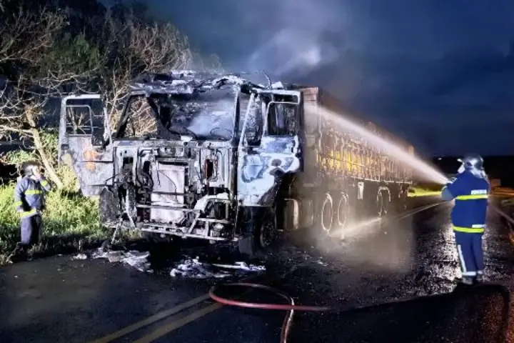 Durante as operações de combate ao incêndio, o trânsito na rodovia precisou ser interrompido temporariamente. Dado que a carreta ficou posicionada sobre a pista, o fluxo de veículos está sendo direcionado em meia pista, exigindo dos motoristas extrema cautela ao passar pelo local.