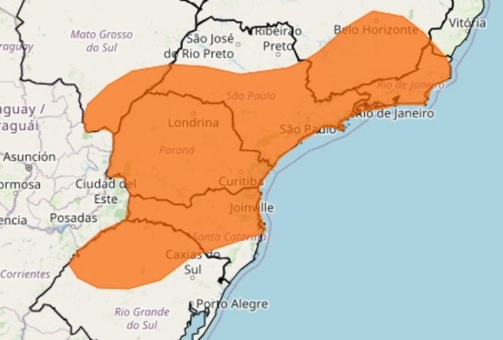 Já o alerta laranja do Inmet indica a ocorrência de tempestades e abrange vários estados brasileiros, conforme é possível ver no mapa abaixo. A divulgação ocorreu por volta das 10h desta sexta e o fim do aviso é às 12h de domingo (21).