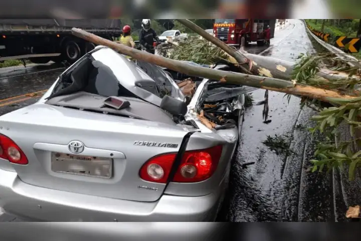 O temporal que atingiu Arapongas, norte do Paraná, na tarde do último sábado (20) provocou um acidente de trânsito em um trecho da PR-444, deixando duas pessoas feridas. Uma árvore de grande porte caiu sobre um carro de passeio com placas de Umuarama.