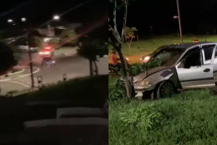 Após algum tempo de acompanhamento ao veículo, o autor perdeu o controle do carro e bateu em uma árvore. Ele então abandonou o veículo e continuou a fuga a pé, pulando o muro de algumas residências e conseguindo escapar dos policiais.