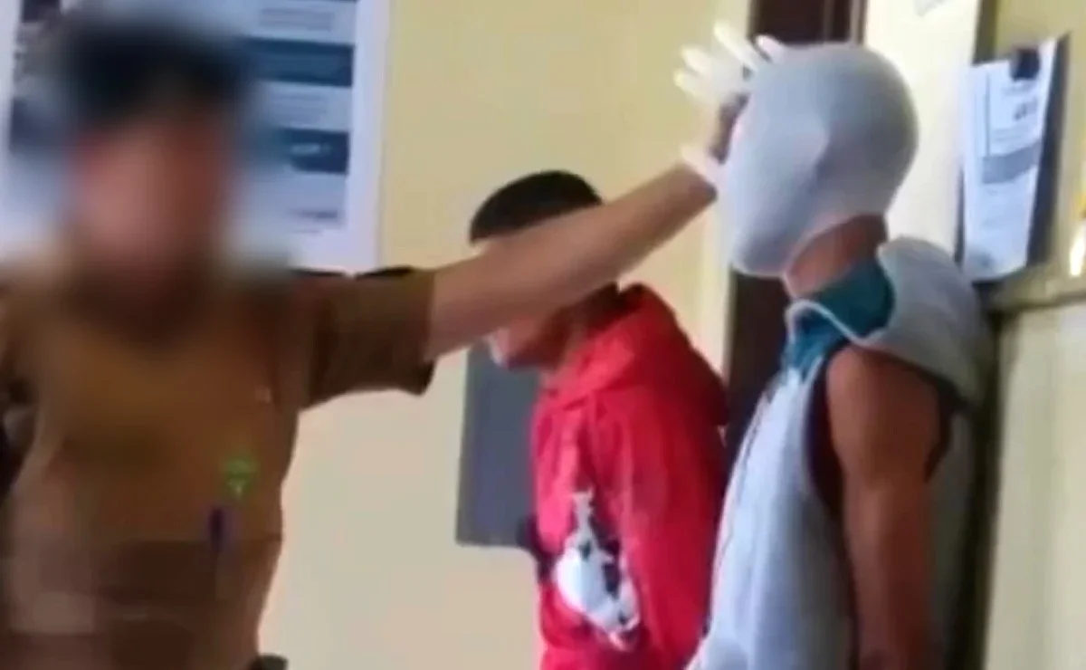 Quatro rapazes aparecem encostados em uma parede com as mãos para trás. O policial usa uma espécie de bastão e bate nas pernas e na sola do pé de um dos jovens. Outro rapaz passou por sessões de afogamento com o que parece ser uma luva de látex.