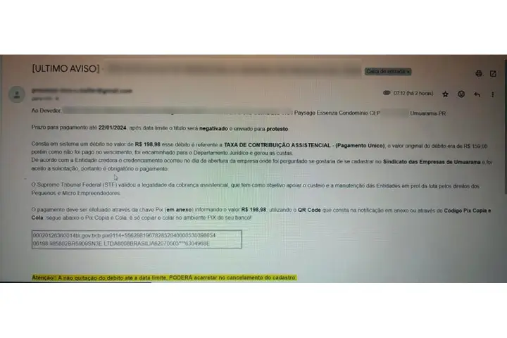 No conteúdo do e-mail os golpistas alegam que a pessoa está inadimplente com a taxa de contribuição assistencial no valor de R$ 198,98. Advertem que caso o pagamento não seja efetuado até a data-limite, o título será cancelado.
