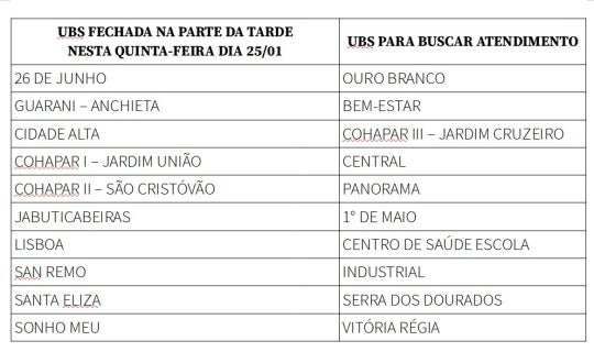 Confira a tabela abaixo com as UBS que estarão fechadas e os locais para se buscar atendimento:
