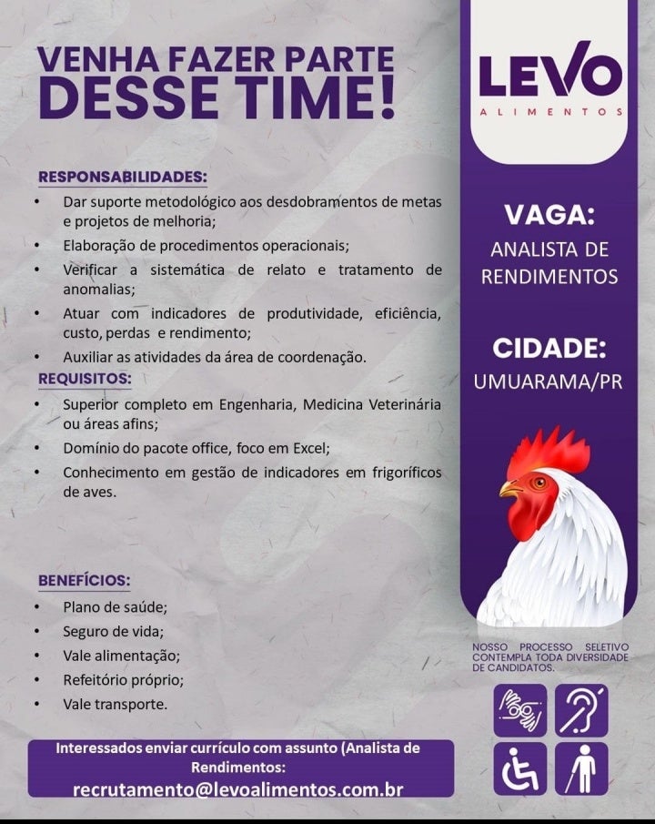 A Levo Alimentos também está com uma vaga disponível para Analista de Rendimentos. Os requisitos são nível superior em Engenharia, Medicina Veterinária ou áreas afins. Interessados podem enviar currículos para o e-mail recrutamento@levoalimentos.com.br