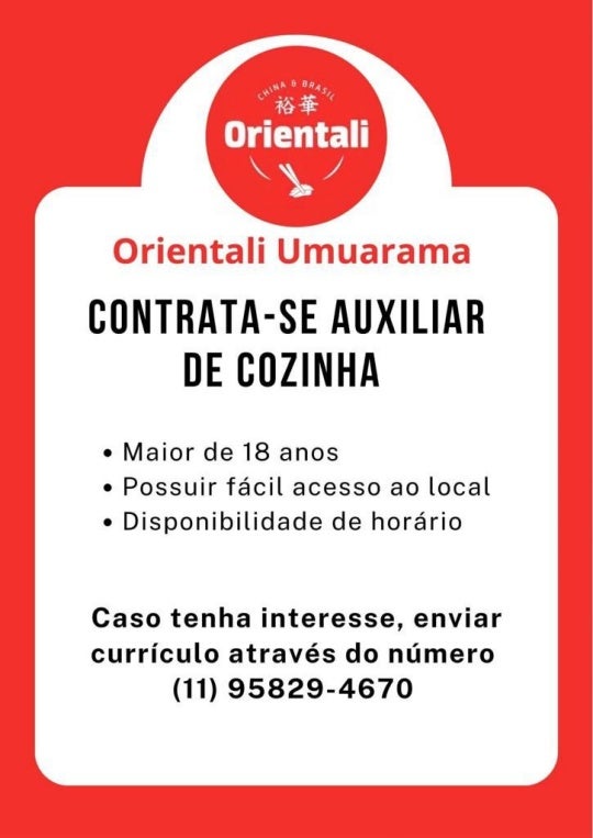 O restaurante Orientali do Shopping Palladium de Umuarama divulgou que está com uma vaga aberta para auxiliar de cozinha. Dentre os requisitos, é exigido que o candidato possua mais de 18 anos e disponibilidade de horário. Currículos podem ser enviados através do WhatsApp (11) 95829-4670.