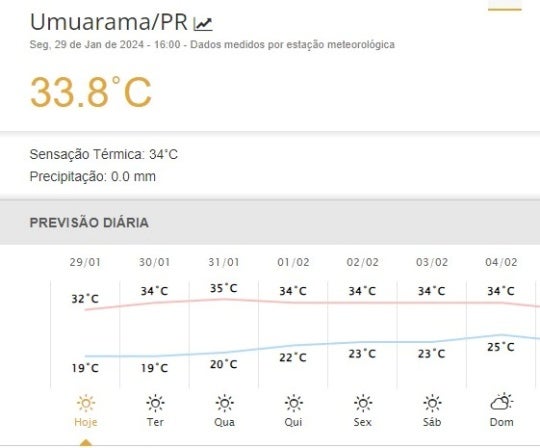 Na terça-feira (30), o Simepar prevê que o dia tenha mínima de 19°C e máxima de 34°C. Na quarta (31), será ainda mais quente, com a temperatura se mantendo entre 20°C e 35°C. Já na quinta (1°/02) sexta (2) e sábado (3) a máxima se manterá em 34°C. Não há previsão de chuva para nenhum destes dias.