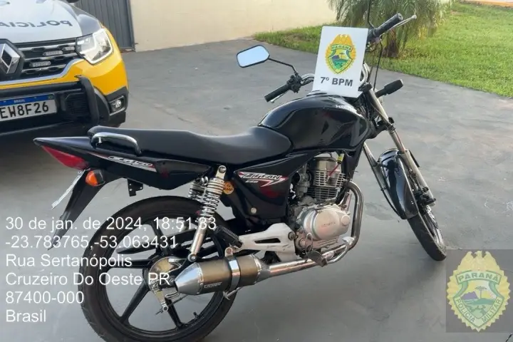 A Polícia Militar (PM) apreendeu uma motocicleta que estava com o escapamento alterado, com etanol e era conduzida por um homem sem CNH (Carteira Nacional de Habilitação) na noite desta terça-feira (30), na BR-487, a Estrada Boiadeira, em Cruzeiro do Oeste. A ação aconteceu após uma denúncia de “racha” no local.