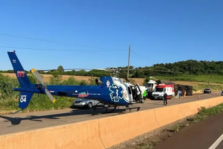 Segundo a Polícia Rodoviária Federal (PRF), um caminhão saiu da pista e tombou. O condutor, de 55 anos, sofreu trauma em tórax e fratura em costelas, precisando ser encaminhado de helicóptero em estado grave para o Hospital Universitário do Oeste do Paraná (Huop).