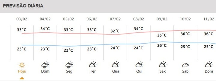 No sábado a temperatura na Capital da Amizade variou entre 23ºC e 33ºC. De acordo com o instituto de meteorologia Simepar, para domingo não estão previstas grandes alterações, com mínima de 23ºC e máxima de 34ºC.