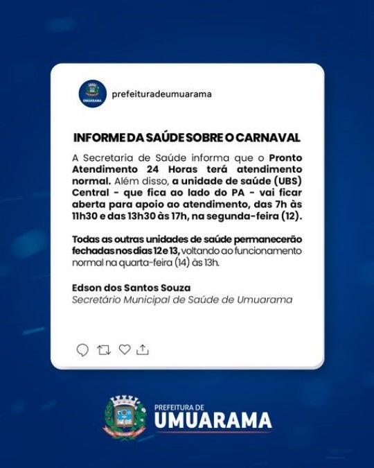 A Secretaria de Saúde de Umuarama emitiu um informe sobre os horários de funcionamento durante o Carnaval na Capital da Amizade. Segundo a nota, o Pronto Atendimento 24 Horas seguirá seu atendimento normalmente e na segunda-feira (12) o Posto de Saúde Central – que fica ao lado do PA 24H – ficará aberto para apoio.