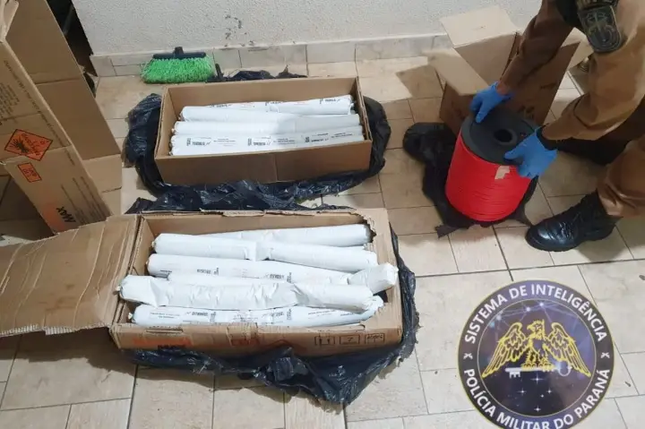 Após receber denúncia anônima e iniciar o monitoramento da área, a Polícia Militar (PM) de Campo Mourão apreendeu cerca de 50 quilos de explosivos e prendeu dois homens na rua Alcides Ferreira de Andrade, no conjunto Maria Barleta. A ação aconteceu na noite de quinta-feira (8).