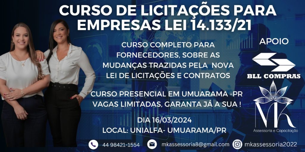 A Empresa MK Assessoria e Capacitação, em parceria com a BLL Compras, realiza no próximo dia 16 de março, na Faculdade Unialfa em Umuarama, um curso sobre as mudanças na Nova Lei de Licitações e Contratos.
