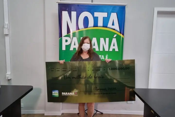A coordenação do Nota Paraná, programa vinculado à Secretaria da Fazenda, entregou nesta quinta-feira (15) o cheque simbólico de R$ 1 milhão para uma consumidora de Paranaguá. Ela foi contemplada no sorteio da semana passada, com o bilhete número 2892076.