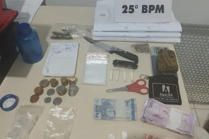 O grupo foi abordado e, nos bolsos de um dos homens foi encontrado o pino de cocaína e com o outro um invólucro de plástico com aproximadamente 10 gramas de maconha prensada. No chão próximo de onde ocorreu a abordagem foram encontrados mais 3 pinos de cocaína.